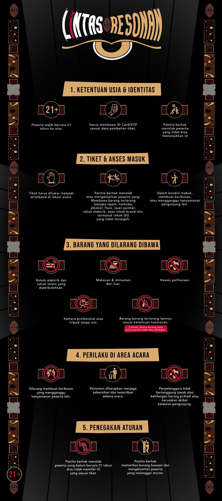 - Penonton wajib membawa identitas diri yang sesuai dengan data pembelian saat registrasi atau penukaran tiket.